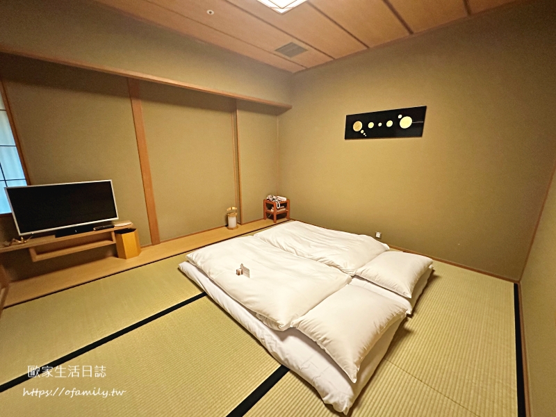 原先我以為床舖會是在客廳的區域,就像有些日本旅館會在客人去用餐後,進房舖床;不過實際上,這是附臥房的房型,所以我們入住時就已經舖好床。客廳、臥房都有電視,不用為了搶電視吵架。