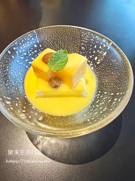 夏季菜單:西瓜茶碗蒸(香瓜裝飾)、清蒸鱸魚、堅果飯糰(未附照片)、兩款生魚片、黑毛和牛鍋物、香煎太刀魚(白帶魚)、竹筍炊飯+漬物+味噌湯(未附照片)、甜點是椰漿芒果酪。