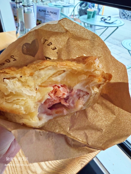 據說最熱門的是鹹派。我們點了兩份當午餐:白醬鮭魚口味及牛肉口味。